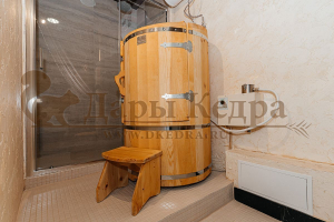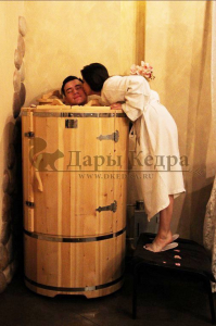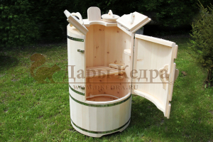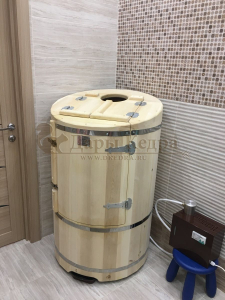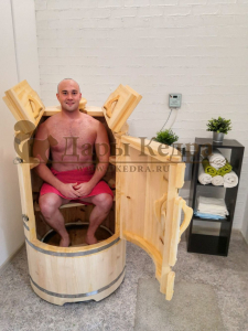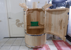 Круглая со скосом. Круглая фитобочка из кедра - это мини парная, которую можно использовать не только в спа-салонах, но и дома. Такая модель наиболее компактна и мобильна. Толщина стенок составляет 25 мм. Фитобочка оборудована откидными створками, дверцей и отверстием для головы. Верхний скос делает положение головы более комфортным и улучшает обзор. Во время парения человек сидит внутри кедровой бочки, а голова находится снаружи. Благодаря этому исключается возможность перегрева. Подлокотники из кедра, встроенные ручки на створках и двери делают эксплуатацию более удобной.