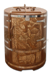 Это круглая фитобочка из кедра увеличенных размеров с толщиной стенок 45 мм. Подходит для людей высокого роста и крупной комплекции. Фитобочка оборудована откидными створками, дверцей и отверстием для головы. Во время парения человек сидит внутри кедровой бочки, а голова находится снаружи. Благодаря этому исключается возможность перегрева. Подлокотники из кедра, встроенные ручки на створках и двери делают эксплуатацию более удобной.
