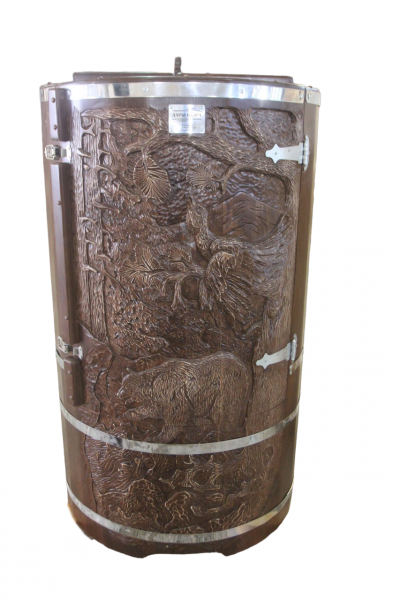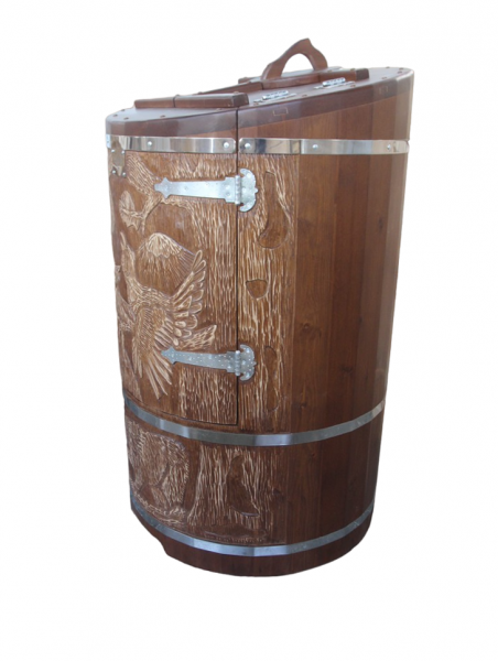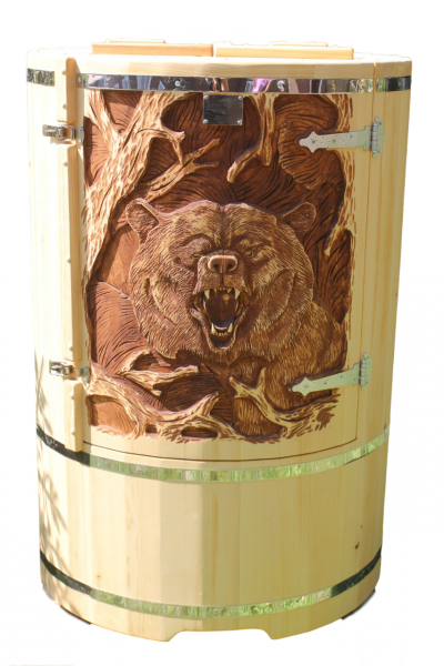 Это круглая фитобочка из кедра увеличенных размеров с толщиной стенок 45 мм. Подходит для людей высокого роста и крупной комплекции. Фитобочка оборудована откидными створками, дверцей и отверстием для головы. Верхний скос изделия делает положение головы более комфортным и улучшает обзор. Во время парения человек сидит внутри кедровой бочки, а голова находится снаружи. Благодаря этому исключается возможность перегрева. Подлокотники из кедра, встроенные ручки на створках и двери делают эксплуатацию более удобной.